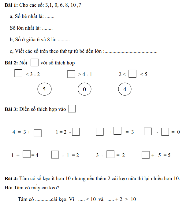 Phiếu bài tập Toán lớp 1 – Tuần 10